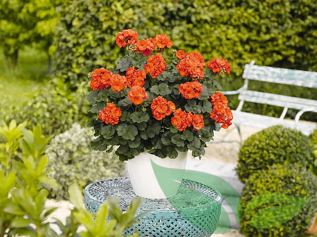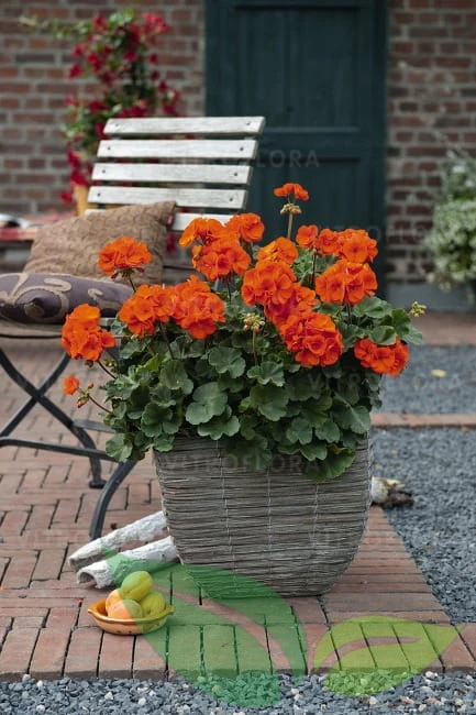 Atrakcyjna odmiana pelargonii pasiastej (Pelargonium zonale), wyróżniająca się intensywnymi, pomarańczowymi kwiatami i zwartym pokrojem. Roślina tworzy liczne, kuliste kwiatostany, które utrzymują się przez cały sezon letni.