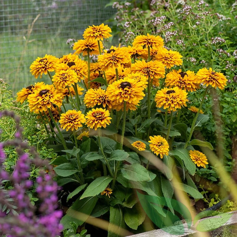 Rudbekia SmileyZ® Double Kissing (Rudbeckia hirta) to wyjątkowa odmiana o pełnych, wielowarstwowych kwiatach w odcieniach żółci i pomarańczu. Dzięki swojemu wyglądowi przypomina małe, dekoracyjne pompony.